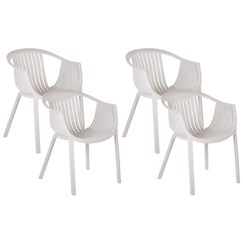 Set van 4 stapelbare kuipstoelen voor buiten. Deze set tuinstoelen komt van pas in elke binnen- of buitenomgeving. De stoelen zijn volledig gemaakt van UV- en waterafstotende, duurzame kunststof. Ze zijn onderhoudsarm en bijzonder gemakkelijk schoon te maken. De stoelen hebben een modern design dankzij het geweven patroon en gebogen armleuningen. De tijdloze beige kleur maakt ze universeel qua stijl, terwijl de brede zitting optimaal zitcomfort biedt. De stoelen zijn voorzien van pootdoppen voor extra oppervlaktebescherming en zijn gemakkelijk op te bergen dankzij de stapelfunctie.