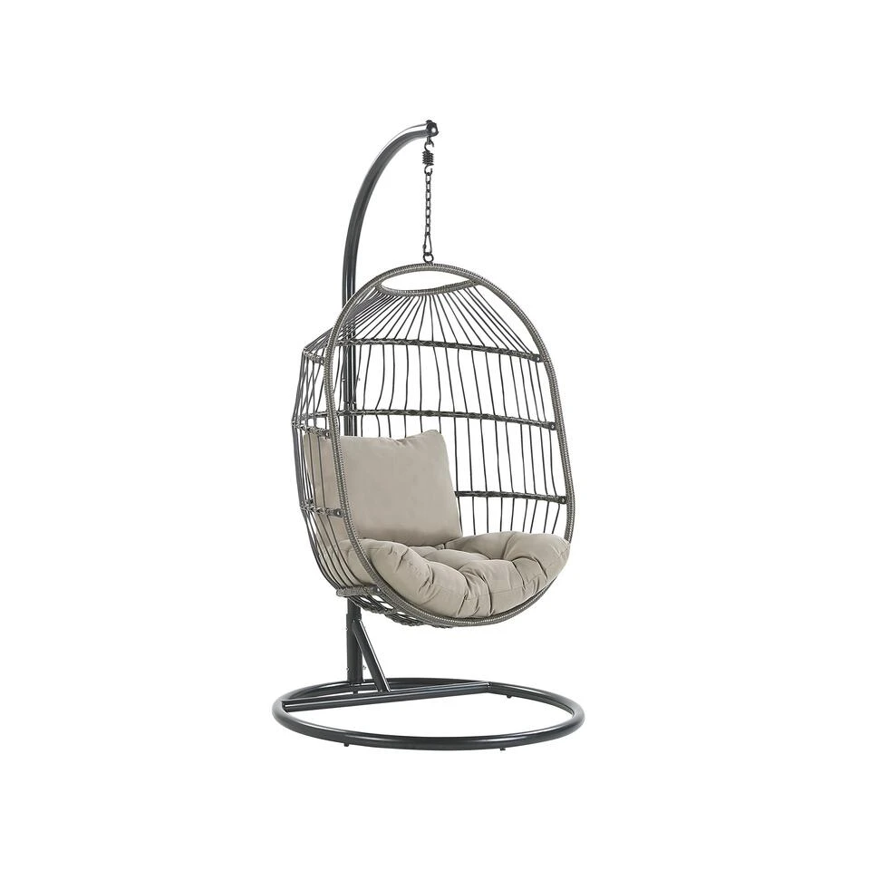 Ronde hangstoel met stalen frame voor binnen en buiten, inclusief kussens. Het opvallende ontwerp van deze hangstoel van robuust polyrotan en polyester zorgt voor een romantisch en zorgeloos vakantiegevoel op de veranda of in de slaapkamer. De gevlochten stoel is opgehangen aan een zware metalen ketting, die op zijn beurt is bevestigd aan een zeer stabiel stalen frame. Zo biedt de stoel rustgevende, subtiele schommelingen en laat je zweven op het comfortabele, waterbestendige zitkussen, zoals op een wolk in de lucht.