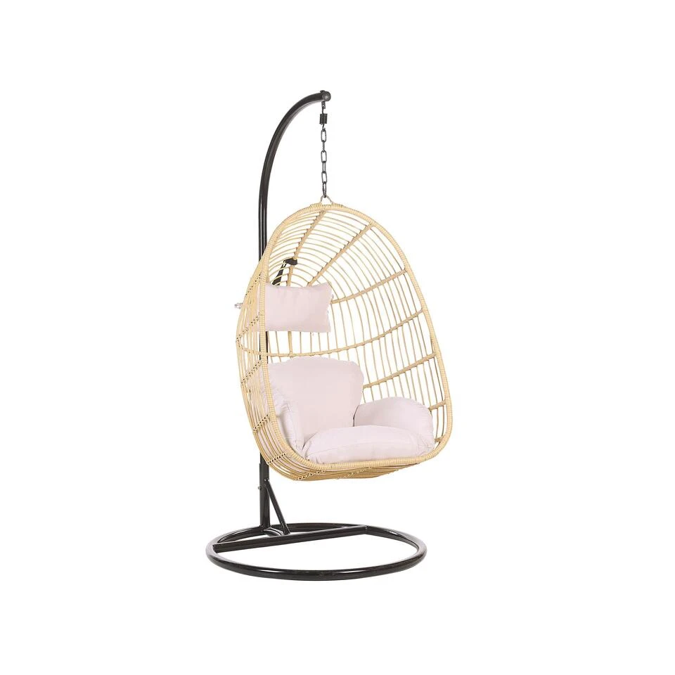 Moderne hangstoel in beige met zwart frame inclusief kussens. Een stabiel stalen frame gecombineerd met een prachtige gevlochten mand in een kleur die in elk interieur past en een feel-good karakter aan de ruimte geeft. Dankzij het sterke ketting-ophangsysteem kun je heerlijk heen en weer schommelen. De charmante boho-look van dit model en de zachte, waterbestendige kussens zorgen voor een onbezorgd gevoel, zodat het verblijf op de veranda, het balkon of in de slaapkamer een heerlijk avontuur wordt.