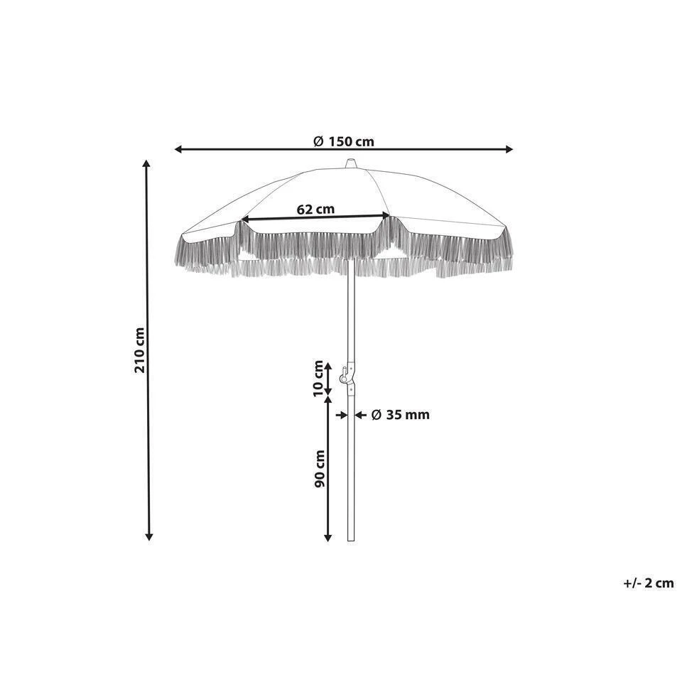 Stijlvolle tuinparasol met kwastjes. Rust je tuin uit met deze parasol om de ruimte op te frissen en er een retrosfeer aan toe te voegen. Het stuk, dat wordt geleverd in een groen-witte kleur, is gemaakt van hoogwaardige materialen – de paal is gemaakt van beukenhout, dus het is zeer duurzaam en bestand tegen verschillende buitenomstandigheden. De paraplu beschermt je ook tegen de zon door het kantelmechanisme en een bovenkant van gerecycled polyester die UV-bestendig is. Bovendien wordt de parasol geleverd in een hoes met handgrepen, zodat je hem gemakkelijk kunt vervoeren of opbergen.