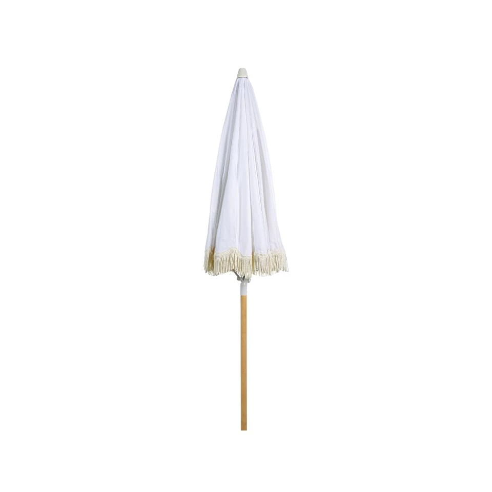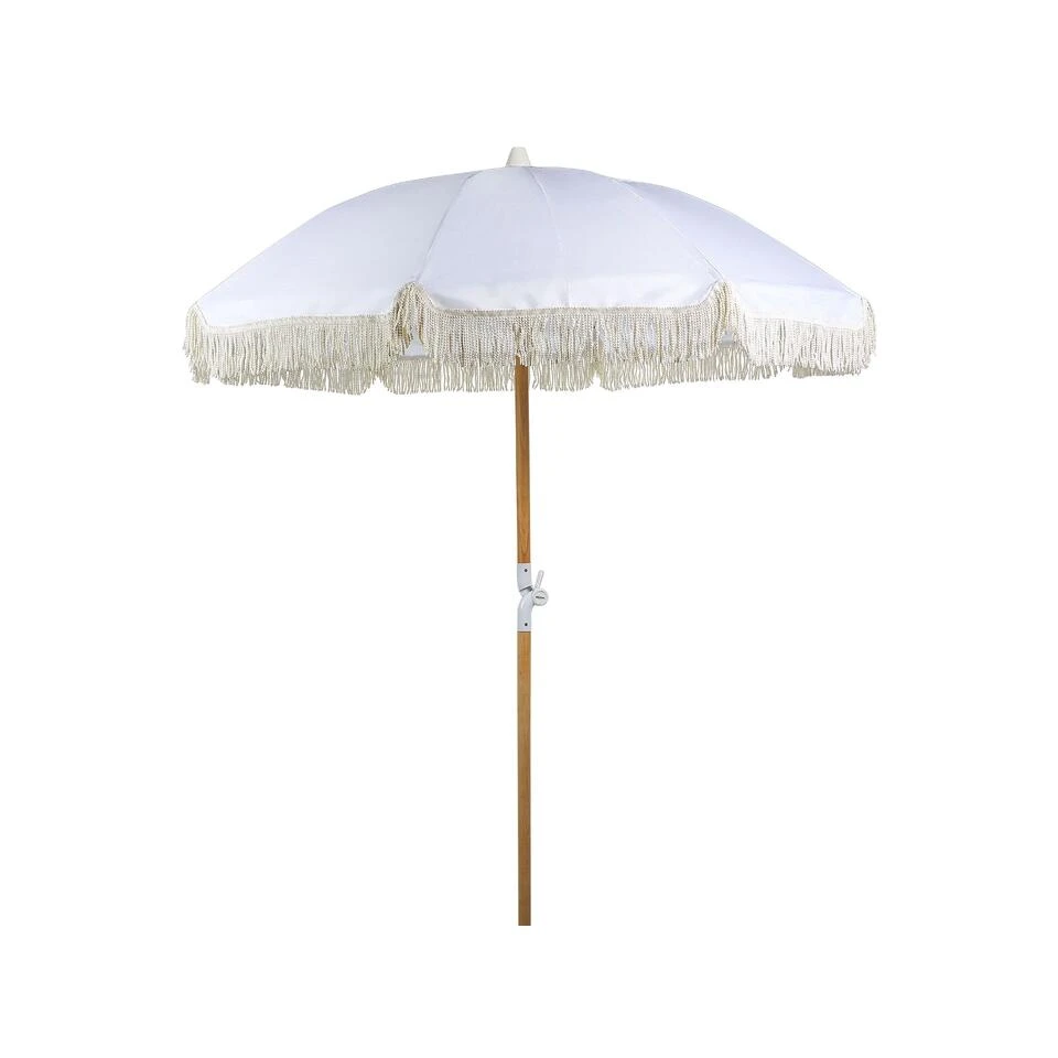 Stijlvolle tuinparasol met kwastjes. Rust je tuin uit met deze parasol om de ruimte op te frissen en er een retrosfeer aan toe te voegen. Het stuk, dat wordt geleverd in een witte kleur, is gemaakt van hoogwaardige materialen – de paal is gemaakt van beukenhout, dus het is zeer duurzaam en bestand tegen verschillende buitenomstandigheden. De paraplu beschermt je ook tegen de zon door het kantelmechanisme en een bovenkant van gerecycled polyester die UV-bestendig is. Bovendien wordt de parasol geleverd in een hoes met handgrepen, zodat je hem gemakkelijk kunt vervoeren of opbergen.