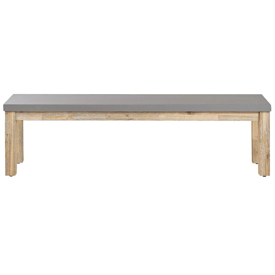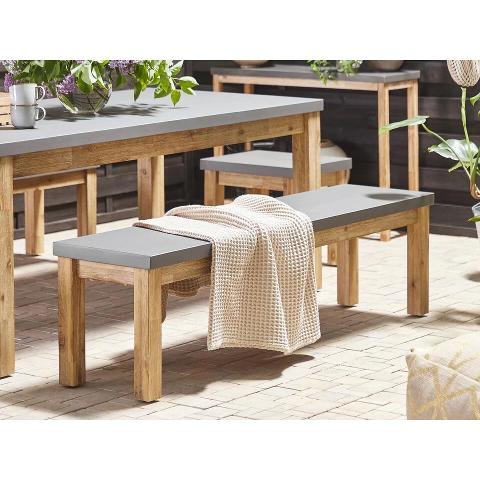 Buitenbank met betonlook zitvlak en acaciahouten frame. Als je houdt van een industriële stijl en buiten dineren, dan is deze bank zeker iets voor jou. De tuinbank combineert perfect de stoere uitstraling van de vezelbeton zitting met een houten onderstel. Het sterke en stevige acaciahout garandeert duurzaamheid en biedt tegelijkertijd een klassieke, natuurlijke uitstraling. Deze veelzijdige bank is een prachtige aanvulling op vrijwel elke buitenruimte, van een klein balkon tot een grote tuin. Combineer het met een bijpassende tafel en creëer de perfecte setting voor je buitenfeesten.