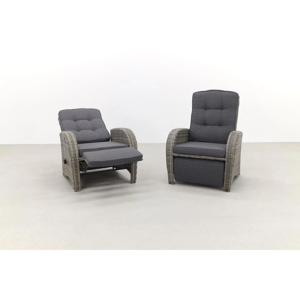 Het frame van de verstelbare loungestoel Casablanca is van aluminium. Dit materiaal is licht van gewicht, erg stevig en onderhoudsvriendelijk. Om dit frame is kunststof vlechtwerk gevlochten. Dit wicker is uitgevoerd in de kleur Light grey. Hierdoor krijgt deze stoel zijn mooie uitgesproken uitstraling. Het wicker wordt ook wel 2-ply wicker genoemd en is heel sterk. Deze loungestoel gaat hierdoor nog jaren mee! De kussens van de verstelbare loungestoel zijn grijs van kleur, dit combineert erg mooi bij het vlechtwerk.Â