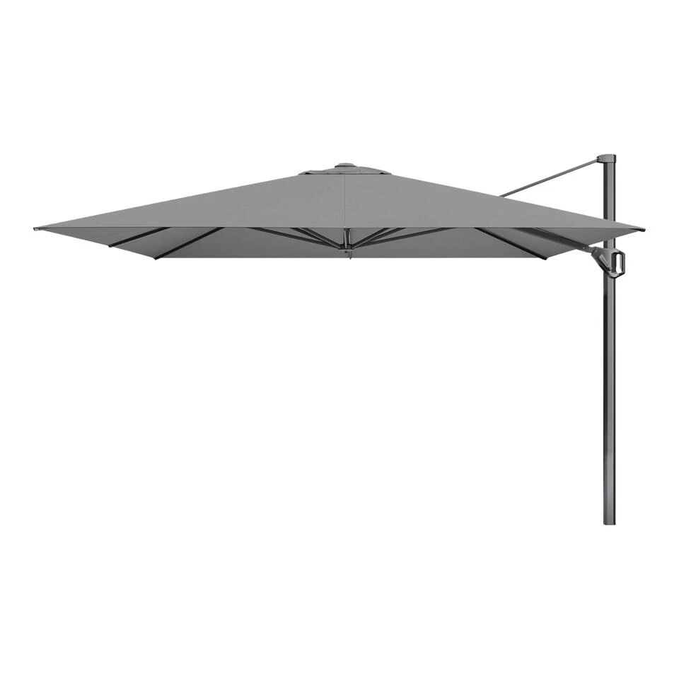 De Challenger T1 parasol is een ruime parasol van hoge kwaliteit. De parasol is 3 bij 3 meter en creeërt een groot schaduwoppervlak. De Challenger parasol kan 360 graden worden gedraaid en kan daarnaast naar het bedieningspaneel worden gekanteld. Hiermee kan je inspelen op een laagstaande zon. Het frame van de parasol is gemaakt van aluminium. Dit materiaal is erg stevig en heeft als grote voordeel dat het niet kan gaan roesten. Het frame is verder voorzien van een antraciet coating. Het doek van de Challenger parasol is van zeer hoge kwaliteit, deze is namelijk uitgevoerd in stofklasse 4. De kleur van het doek is Manhattan. De baleinen van de Platinum Challenger parasol zijn net als de mast gemaakt van aluminium. Aan de uiteinden zijn doekspanners gemaakt. Deze zorgen ervoor dat het doek altijd mooi strak gespannen staat. Hierdoor heeft de parasol een luxe uitstraling.