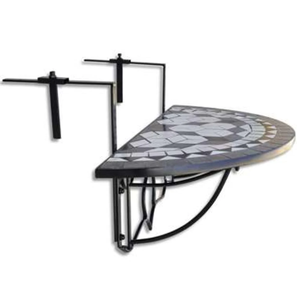 Het ijzeren frame draagt bij aan de stevigheid en het halfronde, keramische tafelblad is gemakkelijk schoon te maken. Deze balkontafel kan op elk terras- of balkonrailing tot 18 cm breed worden bevestigd. Hij kan gemakkelijk worden ingeklapt wanneer hij niet wordt gebruikt, waardoor er ruimte wordt bespaard! Let op, dit product is niet geschikt om in koud weer buiten te staan.
